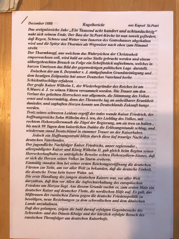 Die folgenden Bilder zeigen die Dokumente, welche in einer in der Turmspitze eingelagerten Kapsel für die Nachwelt aufbewahrt wurden.