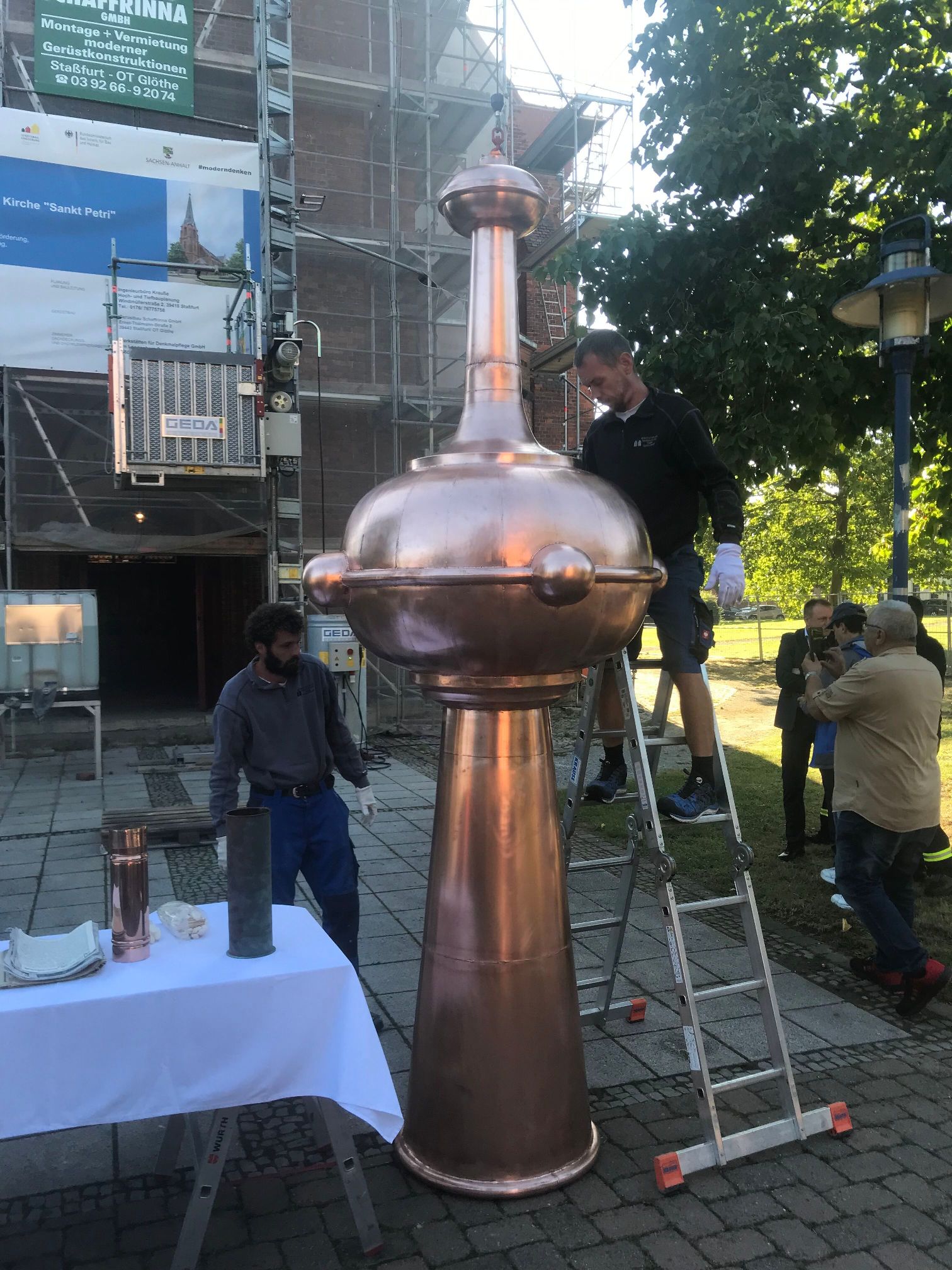 und nahm seinen angestammten Platz auf der Spitze wieder ein. Die originale Kugel ist heute im Kirchenschiff