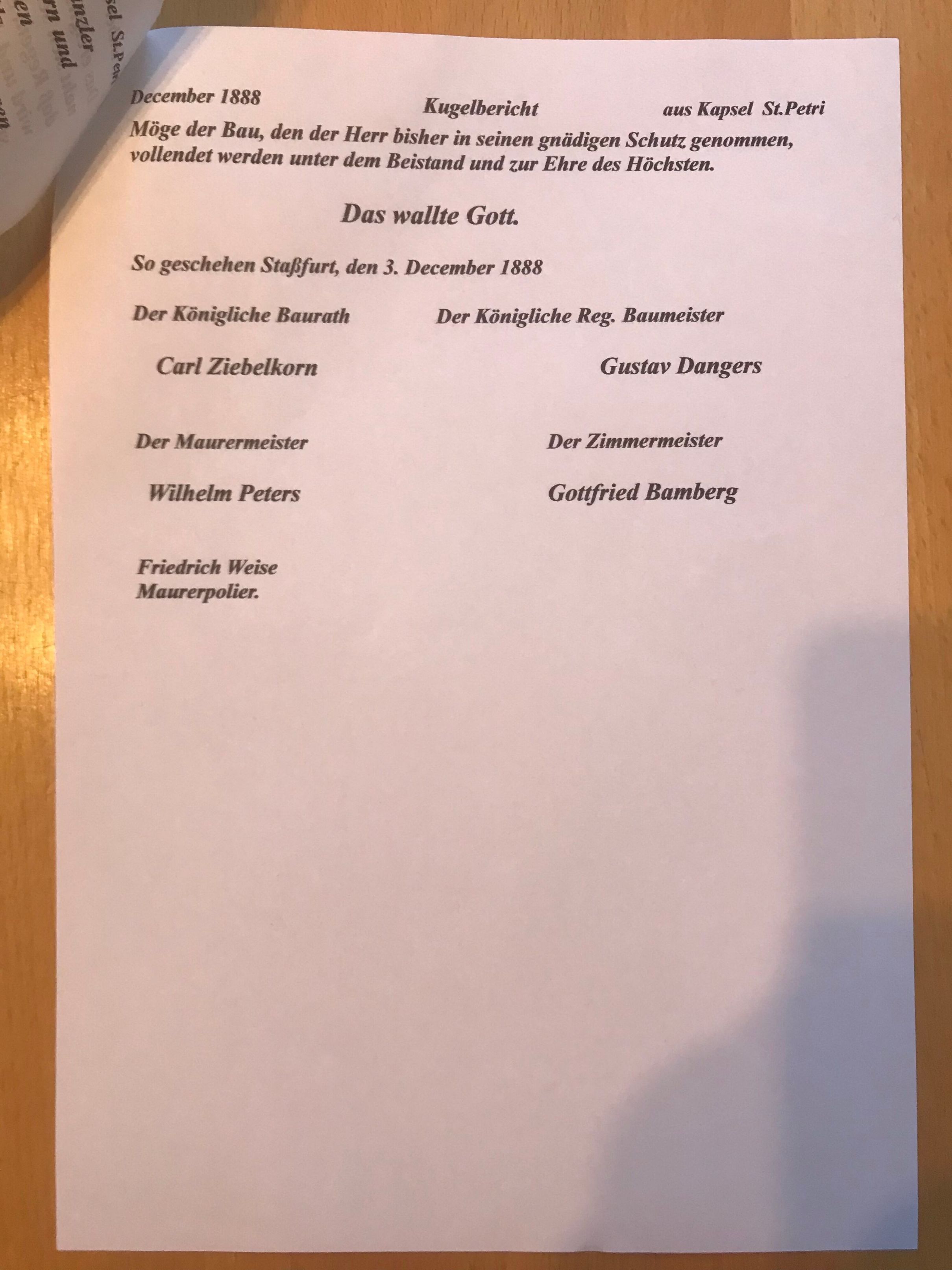 Dies ist der Bericht, welcher mit der Fertigstellung des Turmes beim Neubau der Kirche in der Kapsel