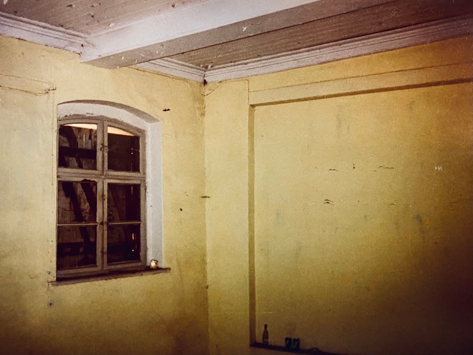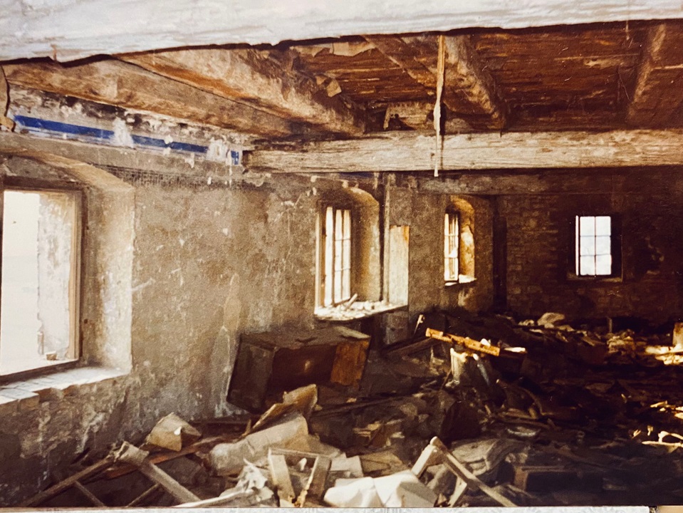 eine Wohnung waren. Das Mauerwerk war fast einen Meter stark. Direkt darüber erstreckte sich über die gesamte Giebelbreite ein Raum mit vier Fenstern, der